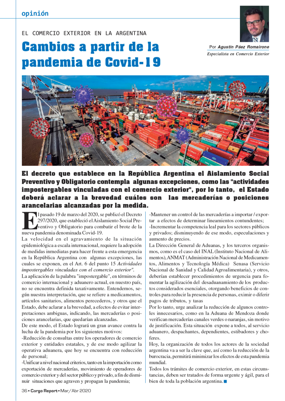 La velocidad en el agravamiento de la situación epidemiológica a escala internacional, requiere la adopción de medidas inmediatas para hacer frente a esta emergencia en la República Argentina con algunas excepciones , las cuales se exponen, en el Art. 6 del punto 15 Actividades impostergableses vinculadas con el comercio exterior”.